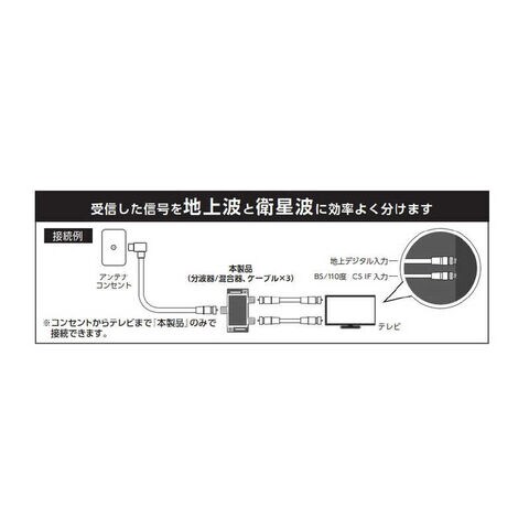 ●地デジ放送、BS/CS放送をそれぞれ視聴したいときに地上波と衛星波を効率よく分け、1台のテレビで地デジ、BS、110度CS放送を視聴できます。