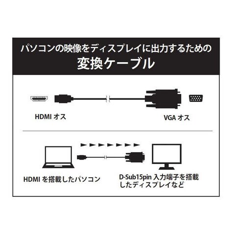 仕様2:[コネクタ形状]HDMIオス - VGA(D-Sub 15pin)オス[対応OS]Windows、Mac 各OS対応 ※Chromebook 非対応[HDMI規格]HDMI Ver1.2[ケーブル長]約1m(コネクタ除く)[解像度]1920×1080に対応[ドライバ]不要[プラグ]金メッキ[本体重量]約68g