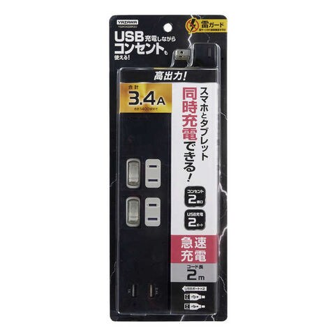 ヤザワ [電源タップ]個別スイッチ付 2AC2USB3.4A2mブラック
