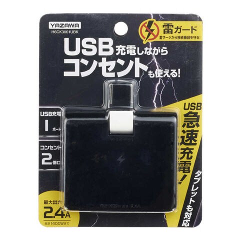 ヤザワ 雷ガード付コーナータップ 2AC+1USB2.4A(2個口+USB1ポート) H6CK3001UBK ブラック