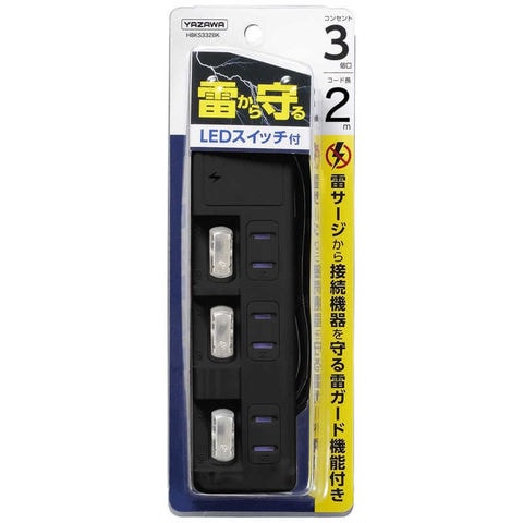 ヤザワ 雷ガード付3個口節電タップ2m ブラック H8KS332BK