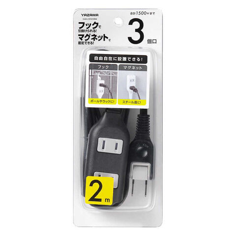 ヤザワ 裏面フックマグネット付タップ3個口2m 黒 360度回転フック付き [2.0m / 3個口 / スイッチ無] H4HJS302BK