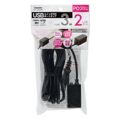 ヤザワ スイッチ付USBタップPD20W 3m 黒 Type-A×1、Type-C×1 集中スイッチ付き [3.0m / スイッチ付き(一括) / 2ポート] H5213PD20BK