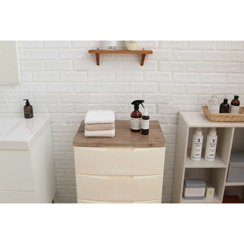 木目調の天板がおしゃれなウッドトップチェストです。落ち着きのあるマットな前面パネルと木目調の天板。引き出しはスライドレールをなので、たっぷり入れても楽に引き出せます。頑丈な天板なので小型テレビや、オーディオ機器も置けます。天板は耐水加工材なので、ランドリーやキッチンなどの水回りでも使えます。