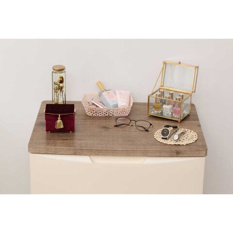 木目調の天板がおしゃれなウッドトップチェストです。落ち着きのあるマットな前面パネルと木目調の天板。引き出しはスライドレールをなので、たっぷり入れても楽に引き出せます。頑丈な天板なので小型テレビや、オーディオ機器も置けます。天板は耐水加工材なので、ランドリーやキッチンなどの水回りでも使えます。