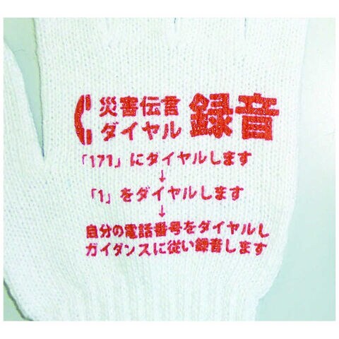 ●災害時に手袋は必需品であり、手の甲に印刷してあることで迷うことなく災害伝言ダイヤルの利用ができます。