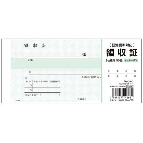 協和紙工 領収証 小切手判2枚複写 50組 62840