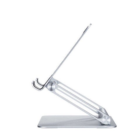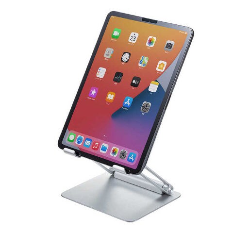 2つのヒンジを搭載し無段階で角度と高さが調整できる、折りたたみにも対応したアルミ製のタブレット用スタンド。