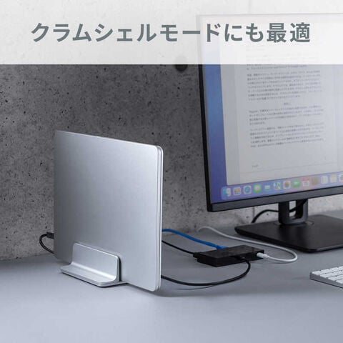 ●ノートパソコンの内蔵ディスプレイを閉じた状態で外部ディスプレイなどと接続して使う際に便利な縦置きタイプのアルミスタンドです。