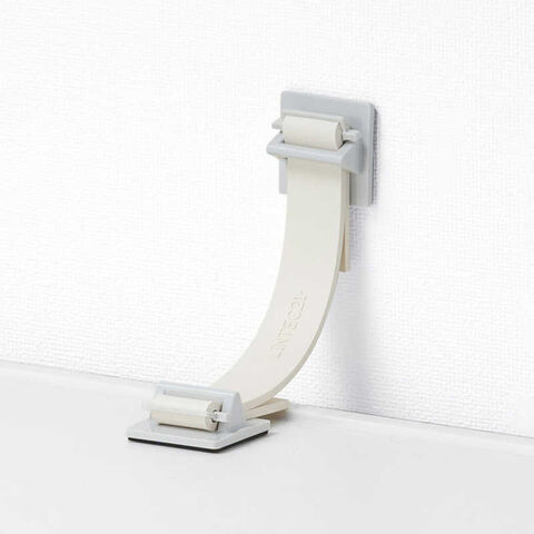 ●ゴムベルトの両端に取り付けられた接着パッド付きフックの一方を冷蔵庫に、もう一方を壁面に接着固定して使用します。