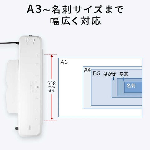 ●A3サイズまで対応し、A4サイズより小さなサイズもラミネートフィルムを挟めば対応可能です。