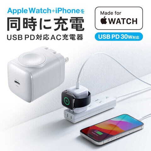 ●iPhoneやiPad、AirPodsなどのUSB Type-Cポートを使って充電する機器とApple Watchを1つの充電器で同時に充電できる、Apple Watch磁気充電モジュール一体型のAC充電器です。