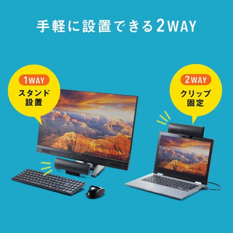 ●スタンド機能もあるクリップ構造になっており、ノートパソコンの画面上部に挟んで固定したり、モニタ下の空いたスペースに設置したりなど2WAYで使用できます。