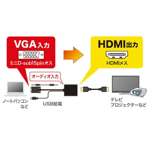 ミニD-sub(HD)15pinアナログ信号(VGA)と音声信号をHDMI信号に変換できるケーブル一体型変換コンバーター