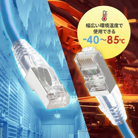 伝送速度1Gbpsに対応、ノイズに強いSTP仕様、対応温度範囲40~85℃、やわらか素材と4.5mm径スリムケーブル、ツメ折れ防止コネクタ採用のカテゴリ5e STP LANケーブル