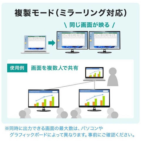 ●2台のディスプレイへの複製出力に対応しておりノートパソコンの画面を含めた場合、最大3画面に同じ画面出力(4K/60Hz×2+ノートPC画面)が可能です。