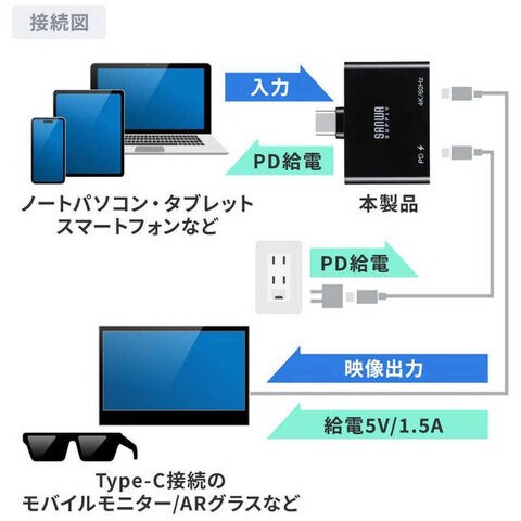 ●USB Type-C搭載(映像出力に対応したType-Cポートのみ)のパソコンやタブレット、スマートフォンからのUSB Type-C映像出力を、PD充電をしながらのUSB Type-C映像出力に拡張できるアダプタです。