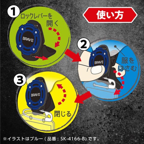 カンタン取り付けひとりでできる!ロックレバーをひらくいて服にはさむだけ。