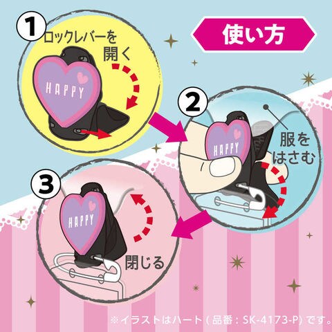 カンタン取り付けひとりでできる!ロックレバーをひらくいて服にはさむだけ。