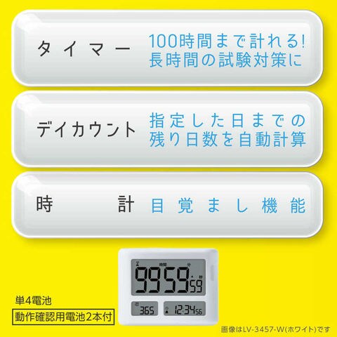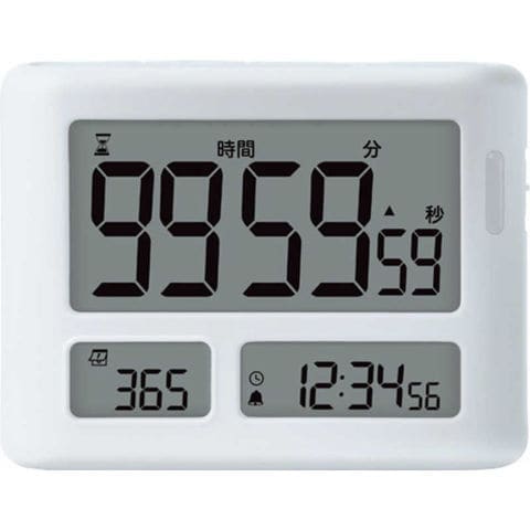 『最大100時間まで計れるタイマー』『指定した日までの残り日数を自動計算して表示するデイカウント』『目覚ましアラーム機能付の時計』の3つを同時に表示します。