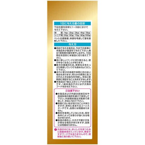シニア期の健康に配慮し、グルコサミン・コンドロイチン、植物性乳酸菌K71、DHA・EPA、オリゴ糖、コラーゲンペプチドを配合しました。
