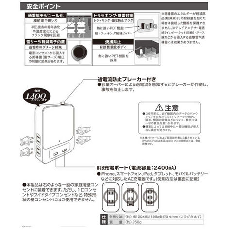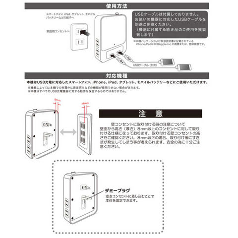 ●質量:(約)250g※ ご注意・ 壁面から高さ(厚さ)8mm以上のコンセントに対して取付ける仕様になっております。 取付ける壁コンセントの高さをご確認ください。 8mm以下の場合、取付後にすき間が発生してしまう事が考えられます。 安全のために十分ご注意ください。・ 本製品は1口コンセントやワイドタイプコンセントなど特殊形コンセントには使用できません。