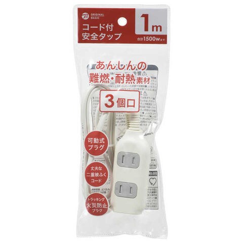 ORIGINALBASIC コード付き安全タップ3個口1m 白 [HSBKTS31W] HSBK-TS31-W