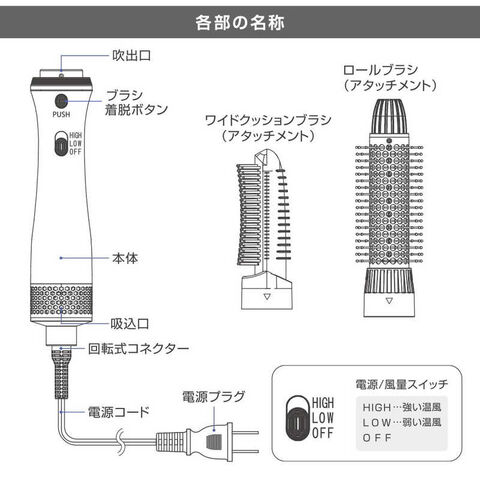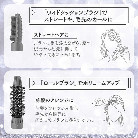 ● 2種類のブラシ付き・ 「ワイドクッションブラシ」でストレートや、毛先のカールに・ 「ロールブラシ」でボリュームアップ