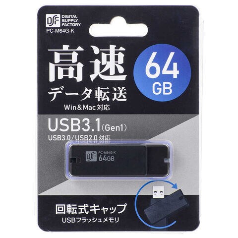 ( 特 長 )● USB3.1 Gen1(USB3.0)高速データ転送対応で、USB2.0にも対応● USBポートに差し込むだけで使用できます● USBインターフェースを搭載した各社DOS/V互換機で、Win&Mac両対応● 回転式キャップ( 仕 様 )● 対応機種:USB3.1(Gen1)/USB3.0/USB2.0 TypeAを搭載するWindowsパソコン/Mac● 対応OS:Windows10/8.1、MacOS10以降● インターフェース:USB3.1 Gen1(USB3.0)、USB2.0● 転送速度(理論値):最大5Gbps(USB3.1 Gen1/USB3.0)、480Mbps(USB2.0)● 容量(USBメモリ):64GB● 電源:DC5.0V(USBポートより供給)● 外形寸法:(約)幅17.7×高さ11.3×奥行56.0mm● 主な材質:ABS● 質量:約8.3g● 付属品:取扱説明書兼保証書(ご注意)※ USB3.1Gen1(USB3.0)高速データ転送を行うには、USB3.1Gen1(USB3.0)のポートに接続してください。