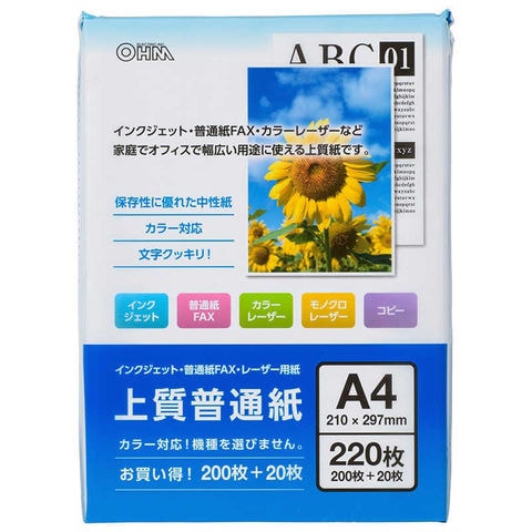 オーム電機 上質普通紙 A4 220枚 OA-PFA422