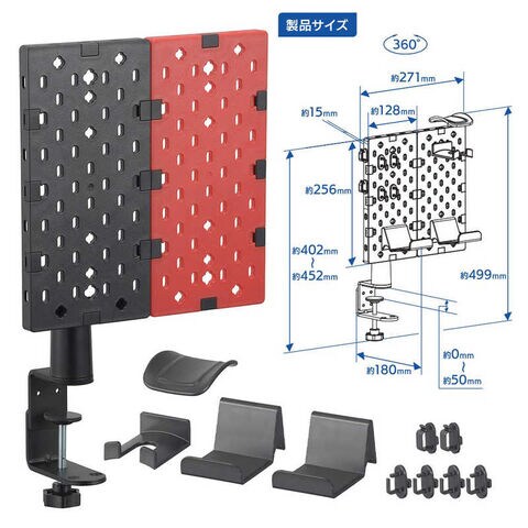 仕様1:[最大荷重]1.5kg[材質]スチール・プラスチック[製品サイズ](約)幅271×高さ499×奥行180mm ※組み合わせによる[質量]約0.95kg[内容物]製品本体(組み立て式)、六角レンチ、取扱説明書[クランプ対応天板厚み]約10mm~50mm