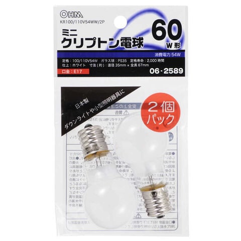 オーム電機 ミニクリプトン球 60形相当 PS-35 E17 ホワイト 2個入 [E17 /一般電球形 /60W相当 /電球色 /2個 /全方向タイプ] KR100/110V54WW/2P