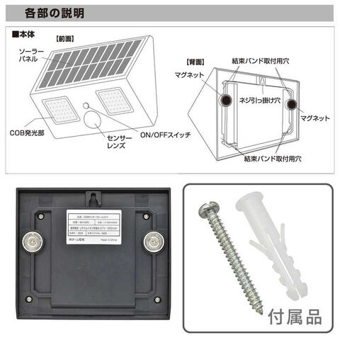 ● 付属品:コンクリート用スリーブ1本、ネジ1本、保証書付取扱説明書【ご注意】※ ご購入時は充電が不十分です。※ 電源をOFFの状態で晴天の日に、約2~5日間充電した後にご使用ください。(電源をONの状態では夜間点灯する事により、充電残量が減り、フル充電できません)※ 初期充電完了後は電源スイッチを常時ONにしてご使用ください。