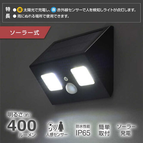 ● 昼は太陽光で充電し、夜は赤外線センサーで人を検知しライトが点灯する、ソーラー発電式人感センサーライト