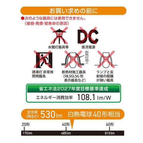 (破損・発煙・短寿命の原因)・ 水銀灯器具等・ 直流電源・ 誘導灯・非常用照明器具・ 断熱材施工器具(SB、SGI、SG形表示器具など)・ ランプと反射板の距離が狭い器具・ リモコンのついた電気器具や回路(適合表示器具を除く)・ ナトリウムランプ・メタルハライドランプなどのHIDランプ器具・ 白熱電球専用の人感センサー付き、遅れ停止スイッチなどの自動点灯器具・ 電球用以外の調光器具(蛍光ランプ用調光器具など)※ 調光器具でも次の器具では使用できません。