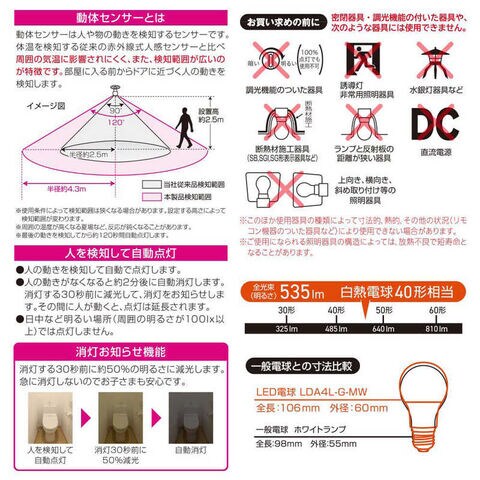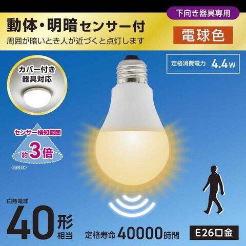 オーム電機 LED電球 動体・明暗センサー付 [E26 / 一般電球形 / 40W相当 / 電球色 / 1個 / 広配光タイプ] LDA4L-G-MW