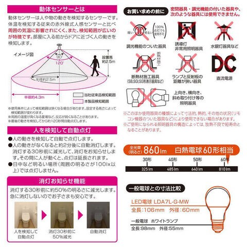 オーム電機 LED電球 動体・明暗センサー付 [E26 / 一般電球形 / 60W相当 / 電球色 / 1個 / 広配光タイプ] LDA7L-G-MWのレビュー