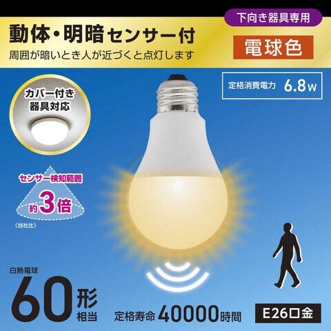 オーム電機 LED電球 動体・明暗センサー付 [E26 / 一般電球形 / 60W相当 / 電球色 / 1個 / 広配光タイプ] LDA7L-G-MW