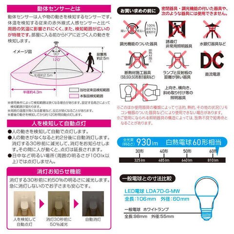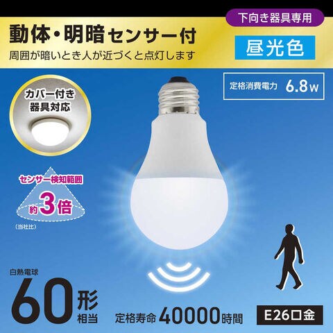 オーム電機 LED電球 動体・明暗センサー付 [E26 / 一般電球形 / 60W相当 / 昼光色 / 1個 / 広配光タイプ] LDA7D-G-MW