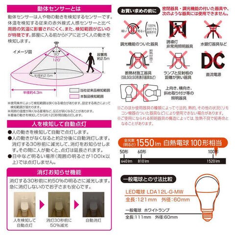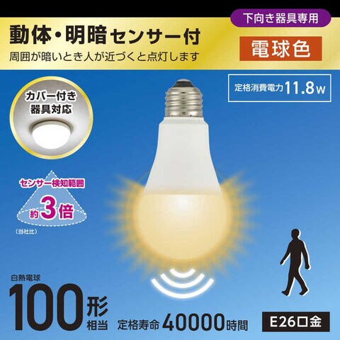 オーム電機 LED電球 動体・明暗センサー付 [E26 / 一般電球形 / 100W相当 / 電球色 / 1個 / 広配光タイプ] LDA12L-G-MW