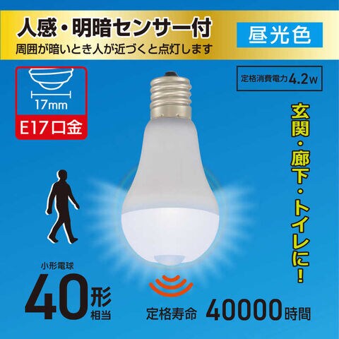 オーム電機 LED電球 小形 人感明暗センサー付 [E17 / 一般電球形 / 40W相当 / 昼光色 / 1個 / 広配光タイプ] LDA4D-G/E17PIR