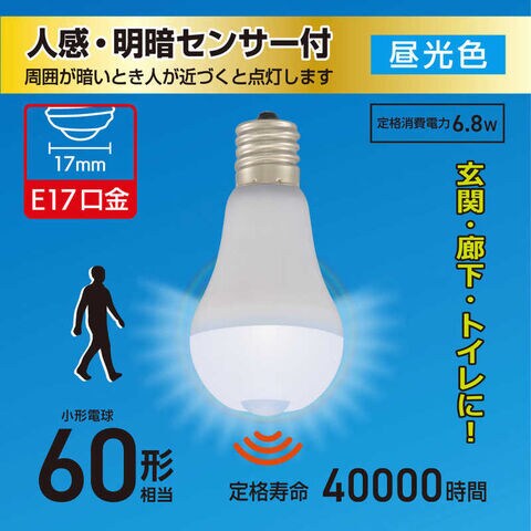 オーム電機 LED電球 小形 人感明暗センサー付 [E17 / 一般電球形 / 60W相当 / 昼光色 / 1個 / 広配光タイプ] LDA7D-G/E17PIR