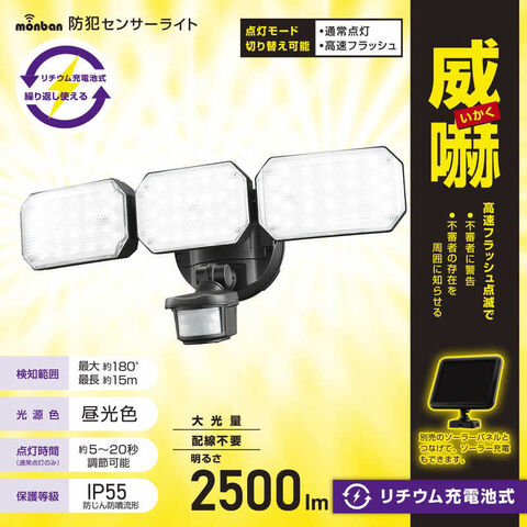 オーム電機 防犯センサーライト3灯リチウム充電池式 LS-B313
