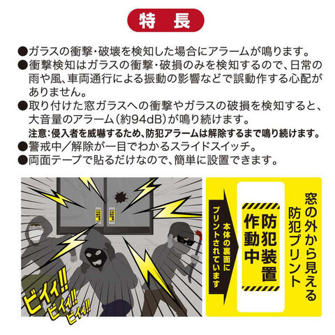 取り付けた窓ガラスへの衝撃や破損を検知すると、大音量のアラーム(約94dB)が鳴り続けます。
