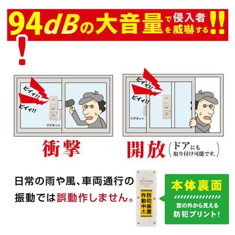 取り付けた窓ガラスへの衝撃や破損・ドアの開放を検知すると、大音量のアラーム(約94dB)が鳴り続けます。
