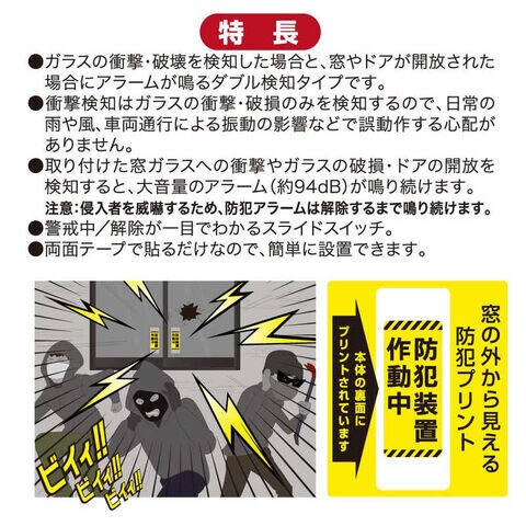 ●取り付けた窓ガラスへの衝撃や破損・ドアの開放を検知すると、大音量のアラーム(約94dB)が鳴り続けます。
