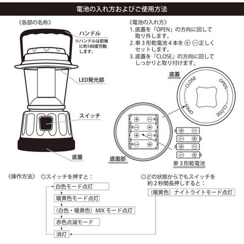 ● 連続使用時間:約3.5時間(白色・暖黄色/MIX モード)、約7時間(白色モード)、約8時間(暖黄色モード)、約65時間(暖黄色/ ナイトライトモード)、約55時間(赤色点滅モード)※明るさ10%まで