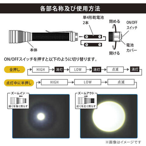 ● ズームイン/遠くを強く照らすズームアウト/近くを広く照らす