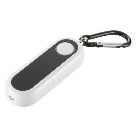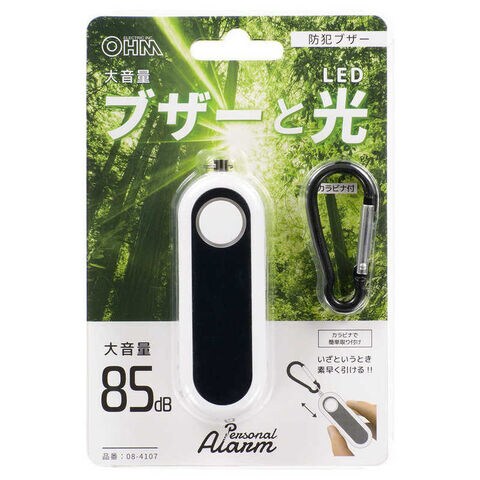 85dBの大音量の防犯ブザー。 カラビナを引っ張るとブザーが鳴ります。