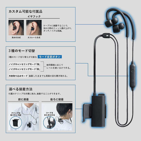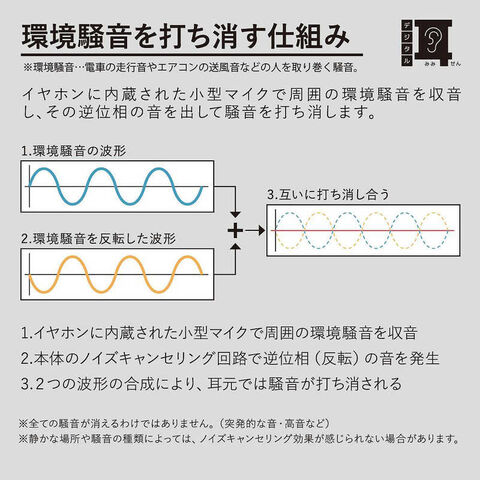 イヤホンに内蔵された小型マイクで周囲の環境騒音を収音し、その逆位相の音を出すことで騒音を打ち消します。アナウンスや呼びかけなど必要な音は聞こえて、車内騒音や機械の動作音などの環境騒音だけをカットするので、仕事や作業中の集中力持続をサポートします。